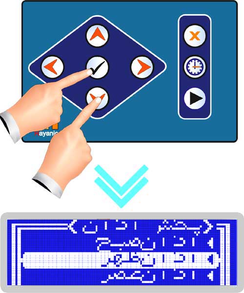 تنظیم ولوم صدای داخلی وخارجی و تعیین عملکرد پریزک مربوطه برای تنظیم ولوم، مکاننما را بر روی این گزینهها قرار دهید. با کلیدهاییاضمن ورود به صفحه تنظیم ولوم، صدای نمونه قرآن نیز پخش خواهد شد. ![]() با کلیدهایو ولوم پخش خارجی و با کلیدهایوولوم پخش داخلی را تنظیم نمائید. با کلیدتغییرات مقدار ولوم را تائید نمائید. عدد جلوی گزینههای پخش تغییر خواهد نمود. حداکثر عدد 32 میباشد. قرار گرفتن علامتدر کنار هر یک از این گزینهها به معنای فعال شدن پریزک داخلی یا خارجی (سوئیچر فعالساز) در موقع پخش اذان میباشد. |