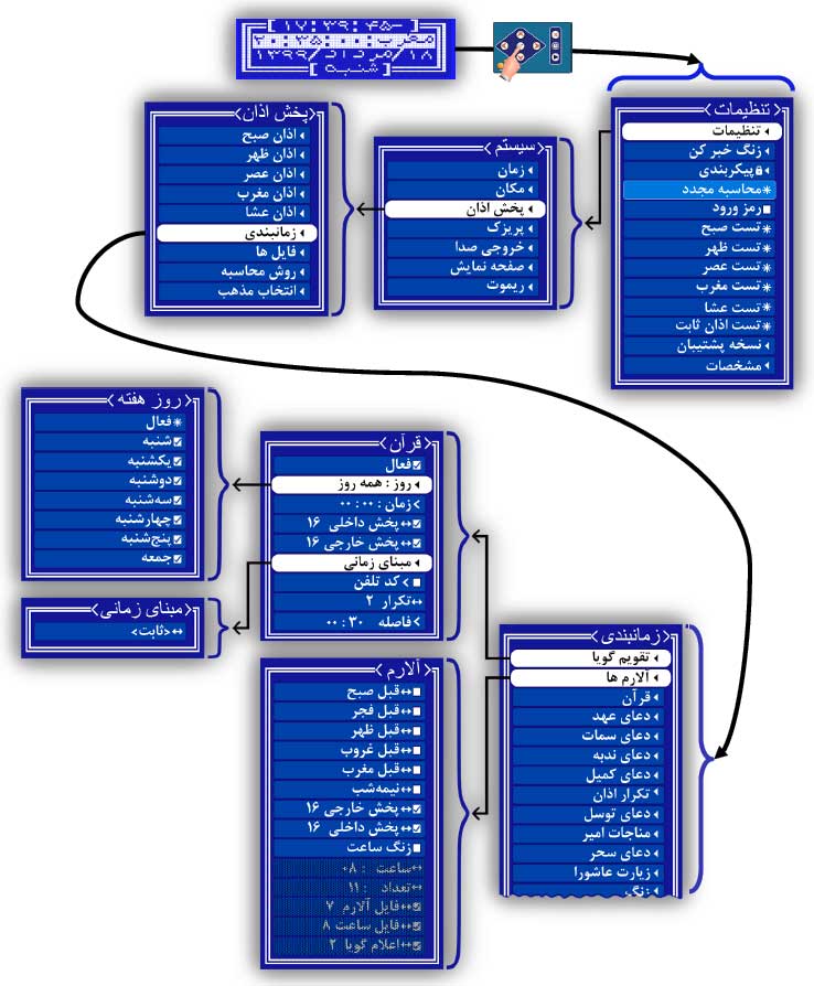 تغییر زمان ثابت پخش به یک زمان وابسته به اوقات شرعی با فاصله زمانی مشخص با کلیدوارد صفحه تنظیمات مبنای زمانی میشوید. به جدول شماره 55 مراجعه کنید. |